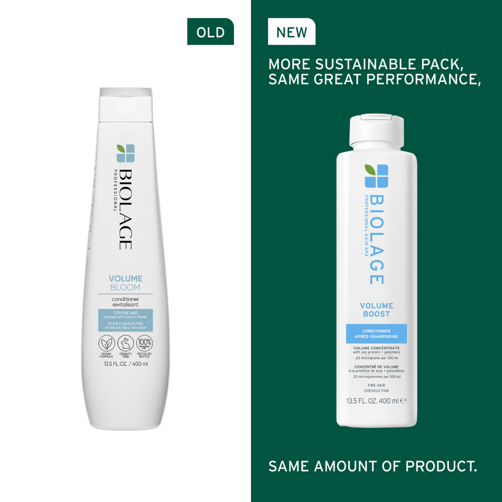Volume Boost Conditioner is infused with a micro-dosed concentrate of soy protein and polymers. This formula weightlessly moisturizes and detangles hair while infusing volume and lift.