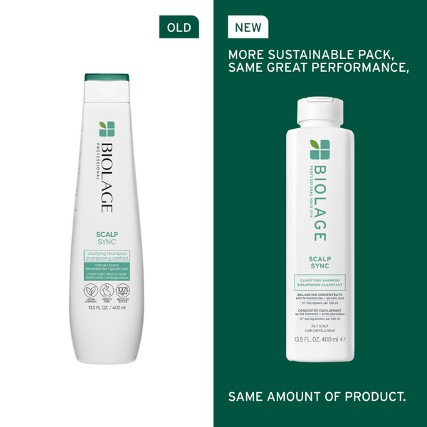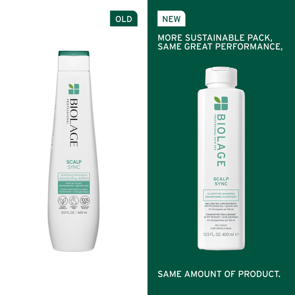 Experience a deep yet gentle cleanse. Scalp Sync Clarifying Shampoo, infused & micro-dosed with fermented tea & filtered glycolic acid, removes up to 100% of scalp residue without drying, restoring volume & shine.