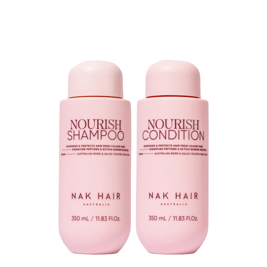 Nak Hair Signature Nourish 350ml Duo nourishes and protects hair from colour fade. Enriched with Nak's Signature Peptides and Ectoin Barrier Booster that assist to repair and strengthen, nurturing the scalp microbiome for your healthiest hair. Duo contains: