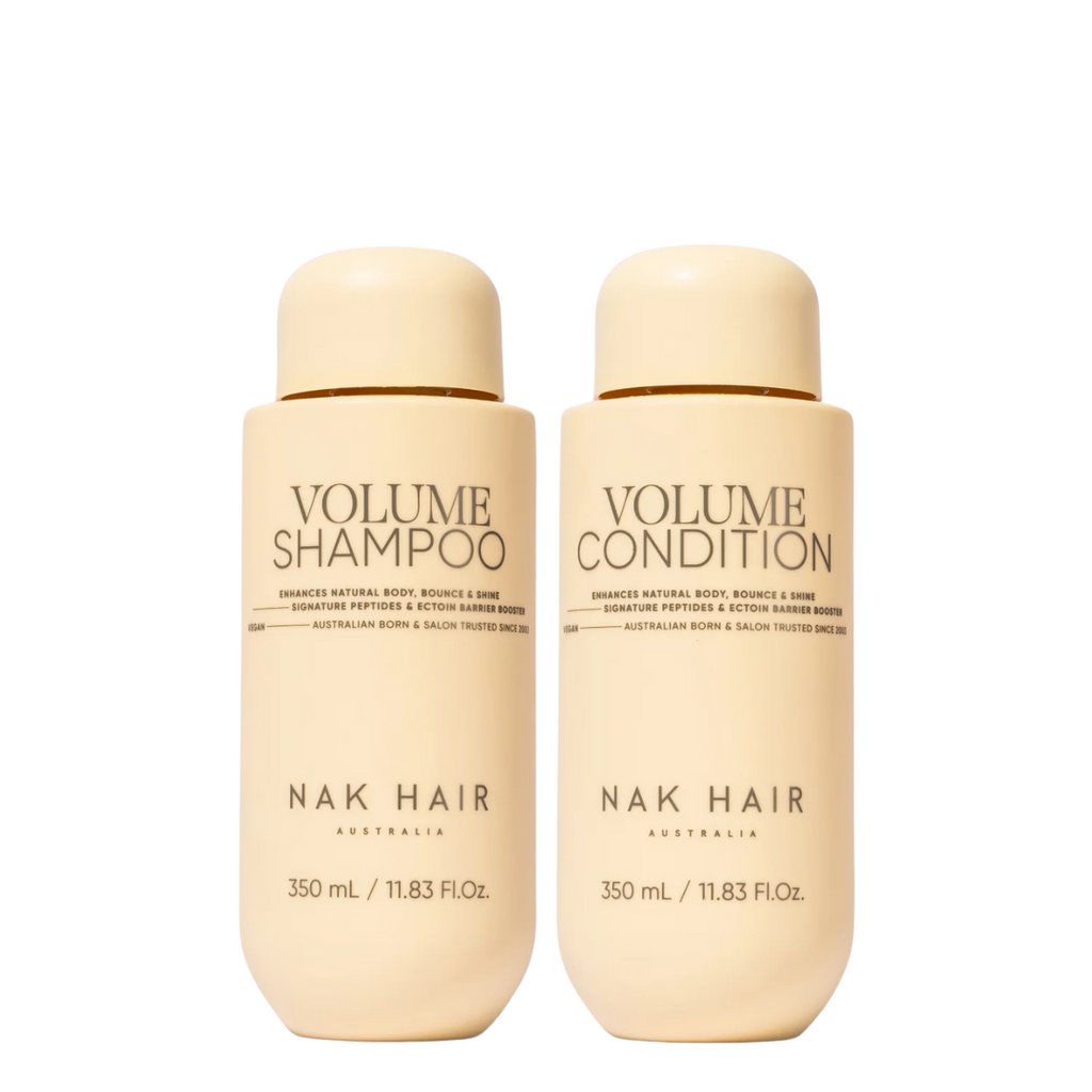 Limited edition Nak Hair Signature Volume 350ml Duo Enhances natural body, bounce and shine. Enriched with Nak's Signature Peptides and Ectoin Barrier Booster that assist to repair and strengthen, nurturing the scalp microbiome for your healthiest hair. Duo contains: