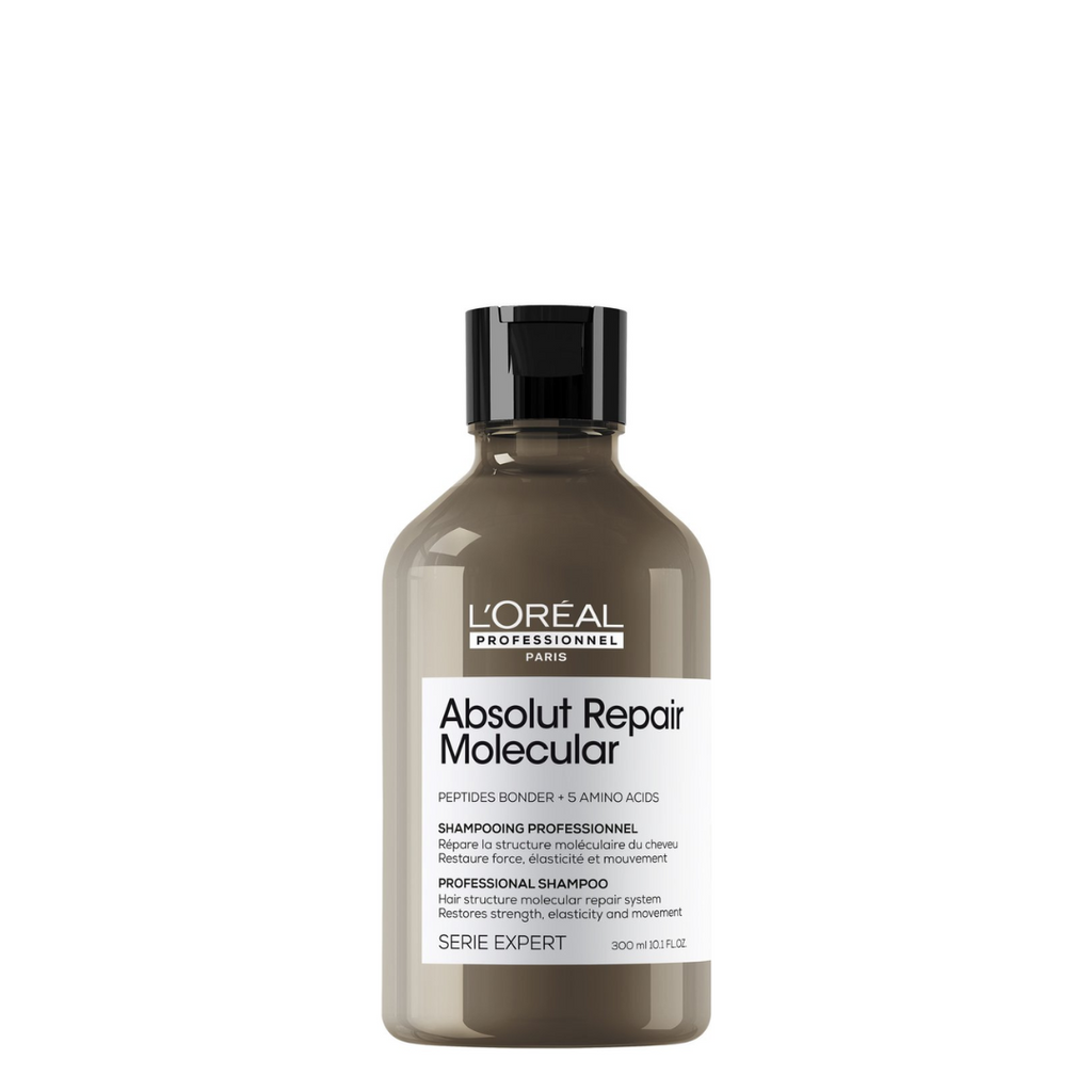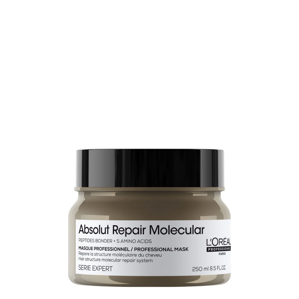 L’Oréal Professionnel Absolut Repair Molecular haircare regime is the ultimate structure molecular repair system designed for all types of damaged hair. Enriched with Peptides and Amino Acids, each Absolute Repair Molecular product works at a Molecular level to rebuild the hairs’ molecular structure** and restore strength, elasticity & movement***. This 2-step haircare routine is to be used weekly as your regular hair-care routine to achieve optimal results.
