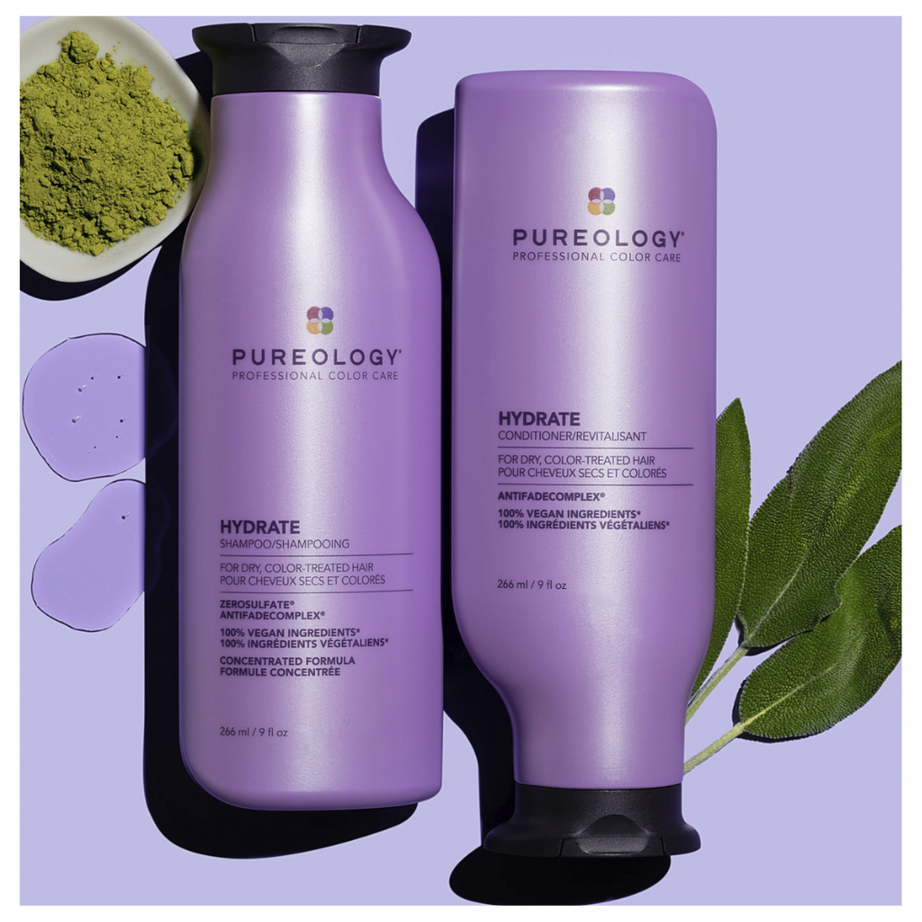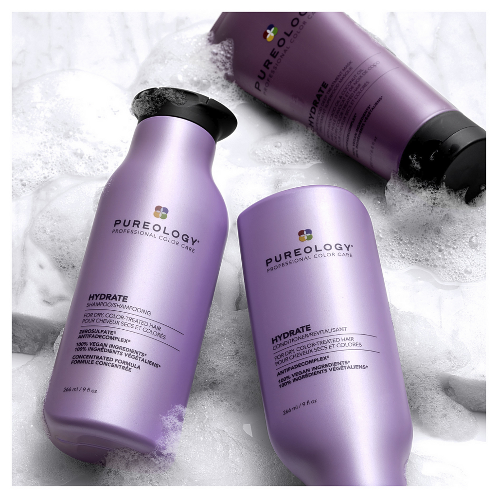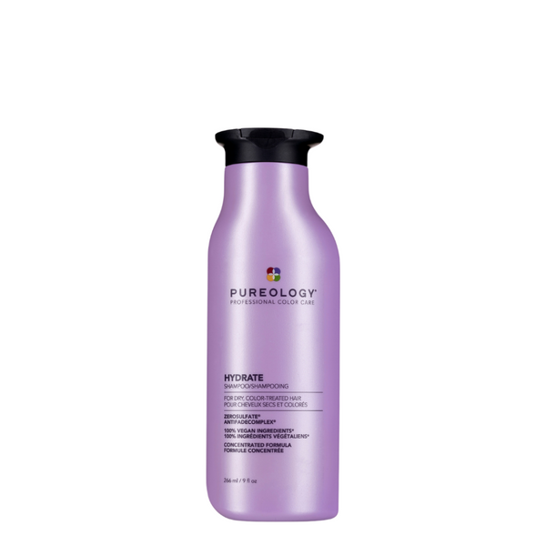 Pureology Hydrate Shampoo deeply hydrates normal to thick dry, colour-treated hair with key ingredients Jojoba, Green Tea, and Sage and a signature aromatherapy blend of Lavendar, Bergamot, and Patchouli. ZeroSulfate, 100% Vegan Formula.