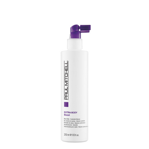 Prep fine hair for big style with Extra-Body Boost volumizing spray from Paul Mitchell®. It contains panthenol to add volume and thickness while its precision nozzle delivers lift at the roots, providing extra "oomph" right where you need it.